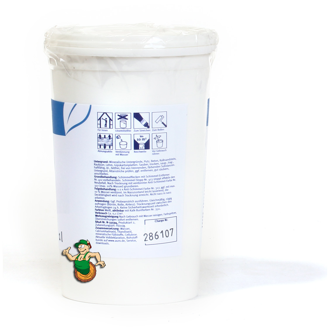 Titandioxidhaltige, emissionsfreie Innen-Wandfarbe mit schimmelhemmendem Effekt durch hohen pH-Wert. Die Farbe ist lösemittelfrei, hat eine hohe Deckkraft und ist sehr einfach zu verarbeiten. Schon vorhandener Schimmel sollte vorab mit Schimmelentferner Nr. 412 und Schimmel-Stop Nr. 413 entfernt werden. AURO Anti-Schimmel Farbe ist chlorfrei. Die Farbe ist weiss, aber abtönbar mit AURO Kalk-Buntfarbe Nr. 350, z. B. Kalk-Buntfarbe Nr. 350-85 Braun.