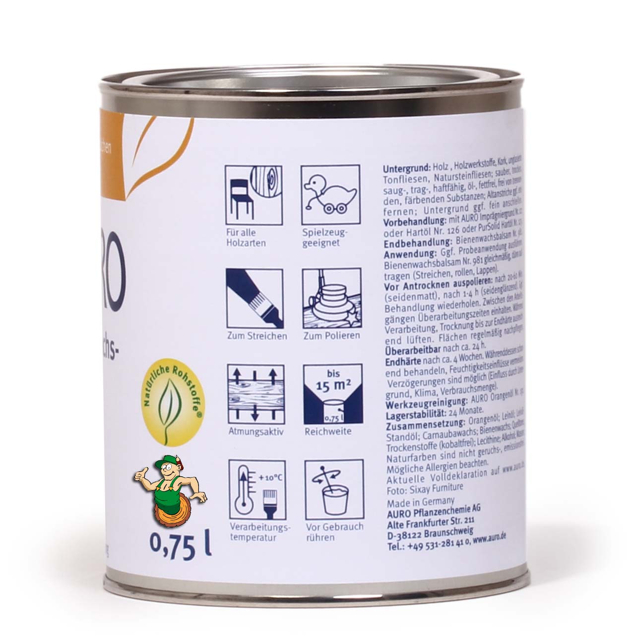 Dieser flüssige Balsam aus Bienenwachs ist für die Pflege von Holz im Innenbereich gedacht und sorgt für eine honiggetönte Holzoberfläche mit angenehmer Haptik. Für seidenmatte Ergebnisse wird das Holz nach 20 bis 60 Minuten poliert, für seidenglänzende Ergebnisse nach 1 bis 4 Stunden.