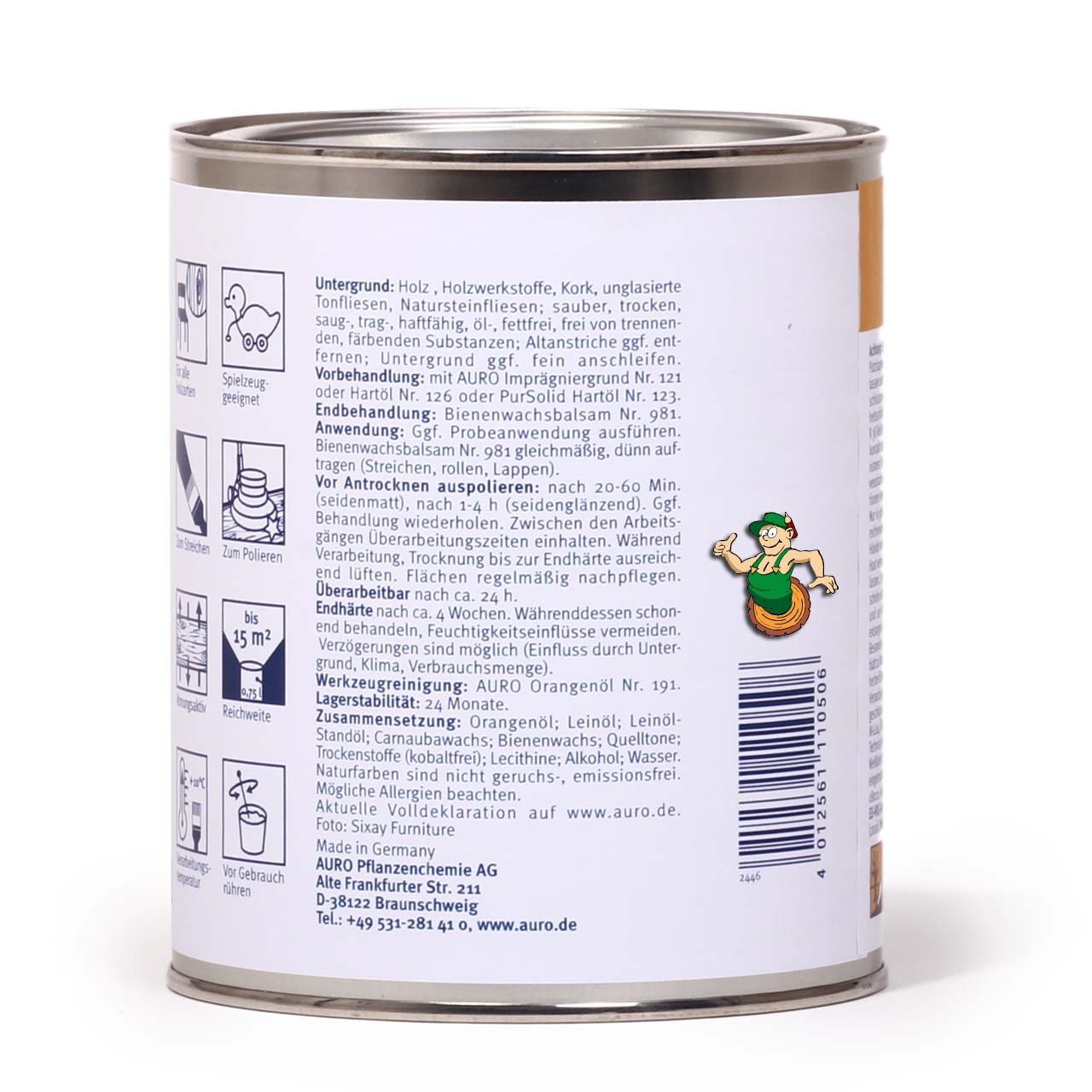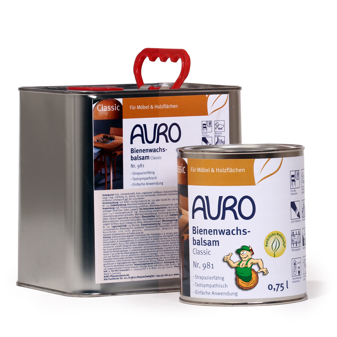 - Tragen Sie den AURO Bienenwachsbalsam Nr. 981 gleichmäßig und dünn auf die Fläche auf. Die Trockenzeit beträgt 24 Stunden. Während der Trockenzeit kann der Bienenwachsbalsam poliert werden