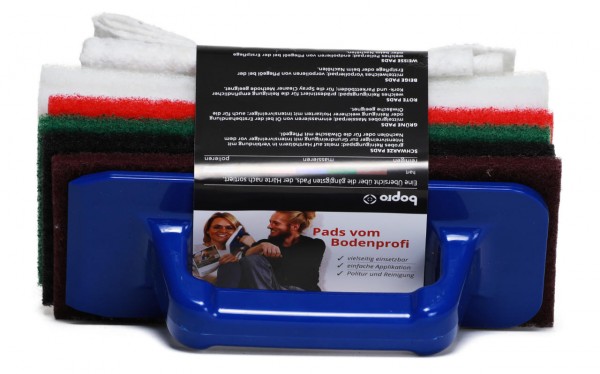 Im Lieferumfang sind Normal-Pads enthalten das Schleifpad schwedenrot für den Zwischenschliff, schwarze Reinigungspads für intensive Reinigungsarbeiten, grüne Massierpads zum Reinigen von empfindlichen Oberflächen und zum Einmassieren von Öl und Pflegeprodukten, rote Pads zum Einmassieren von Öl und Pflegeprodukten oder leichten Reinigungsarbeiten und weiße Pads zum Polieren der behandelten Fläche enthalten. Ein ergonomischer Padhalter für effizientere Arbeitsabläufe rundet das vorteilhafte Angebot ab.