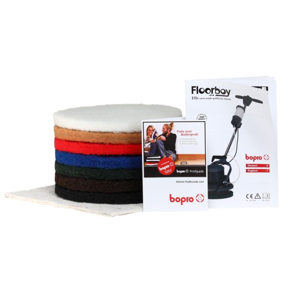 Der Floorboy Z12S wird bereits in der Grundausstattung inkl. Kabel, Treibteller, Tank und einem Sortiment an Pads (1 x grünes Pad, 1 x weißes Pad, 1 x rotes Pad, 1 x beiges Pad, 1 x blaues Pad, 1 x braunes Pad, 1 x schwarzes Pad) für den Start geliefert. Der Floorboy Z12S wird komplett montiert geliefert und Sie können direkt loslegen. Der FBZ12S wird inklusive Tank für wässrige Reinigungsmittel geliefert. Darüber hinaus, erhalten Sie natürlich eine deutsche Bedienungsanleitung mit Garantie und CE Konformitätserklärung sowie unsere kleine Padkunde.