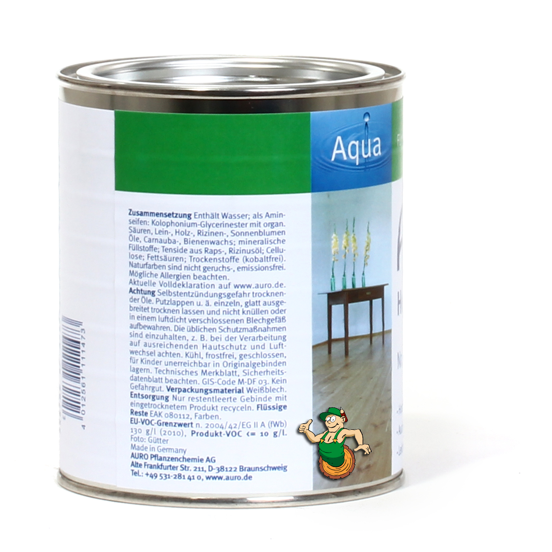 Wasser, Rizinenöl*, Holzöl, Leinöl*, Kolophonium-Glycerinester mit organischen Säuren*, mineralische Füllstoffe, Rapsöl-Tenside,Rizinusöl-Tenside, Trockenstoffe (kobaltfrei), Carnaubawachs* , Bienenwachs*, Cellulose, *als Aminseife, Sonnenblumenöl*