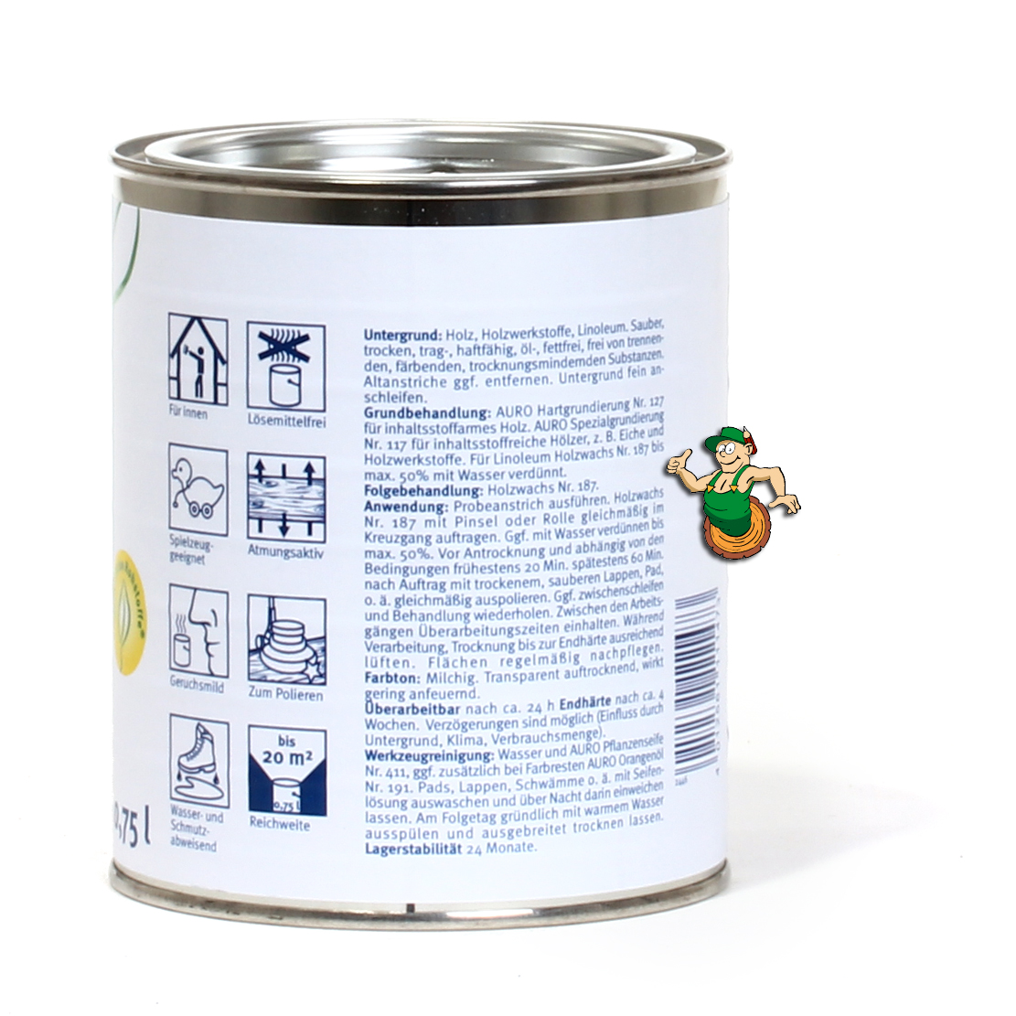 Schmutzabweisendes, lösemittelfreies Wachs für normal beanspruchte Möbeloberflächen und Fußbodenoberflächen aus Holz und Linoleum. Ergibt eine seidenmatte Obefläche mit guter Abriebfestigkeit. Bei inhaltsstoffreichen Hölzern (Bankirai, Red " Cedar", Douglasie ("Oregon Pine"), Hemlock, Lärche, Meranti (Dark Red), Merbau, Niangon, Pitch Pine, Teak, Afzelia, Eiche (auch Kork), Framire, Iroko Kastanie, Kirsche, Okume ("Gaboon"), Redwood und Zeder) empfehlen wir eine Vorbehandlung mit Spezialgrundierung Nr. 117, bei anderen Hölzern mit Hartgrundierung Nr. 127. Autrag erfolgt mit dem Pinsel oder der Rolle und wird frühestens nach 20 Minuten, jedoch spätestens nach 1 Stunde nach Auftrag seidenmatt auspoliert.