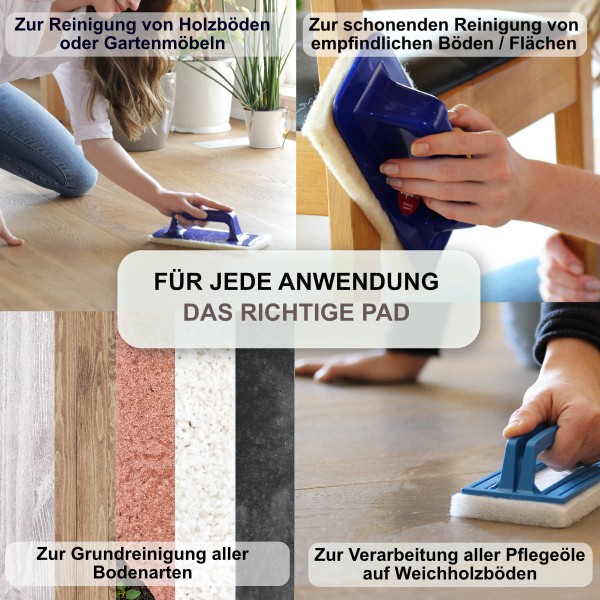 Für den effizienten Einsatz der Pads empfiehlt sich die Verwendung des Padhalter mit Handgriff groß oder, für größere Flächen, des Padhalter für Teleskopstiel.