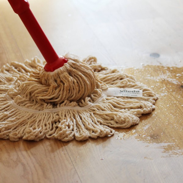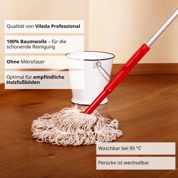 Der Vileda Professional Twistmop (früher auch als Swepmop bekannt) eignet sich hervorragend für die feuchte Alltagspflege bzw. Reinigung geölter Parkettböden mit Holzbodenseife. Natürlich können mit ihm auch andere Oberflächen, wie Laminat- oder Steinböden gereinigt werden. Der Mopaufsatz besteht zu 100% aus Baumwolle und lässt sich problemlos austauschen und waschen (bei 60 Grad). Mit dem Twistmop brauchen Sie Ihre Hände nicht mehr nass zu machen. Das Seifen- oder Schmutzwasser wird durch das gegeneinander Verdrehen der Griffteile am Stiel, ausgewrungen. Also benötigen Sie bloß noch einen Wassereimer (nicht im Lieferumfang enthalten!) um mit der Reinigung zu beginnen. Eine zusätzliche Presse oder Ähnliches ist somit überflüssig.