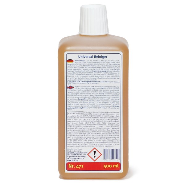 Der AURO Universal-Reiniger Starterset enthält ein 0,5 Liter-Gebinde des bewährten Universalreiniger Nr. 471 und einen 0,25-Liter Sprühspender.