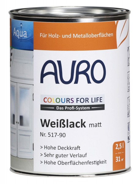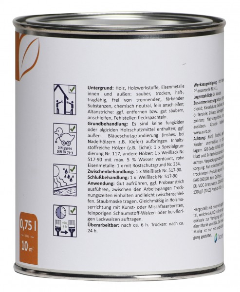 Ein matter, lösemittelfreier Weißlack für Möbel und Metallanstriche, Holzobjekte oder -werkstoffe im Innen- oder Außenbereich. Er ist auf Speichel- und Schweißechtheit geprüft und erfüllt selbstverständlich die "Spielzeugnorm" DIN EN 71-3. Daneben zeichnet sich der Lack durch beste Werte bei Nassabrieb und Deckkraft (gemäß DIN EN 13300) aus, außerdem ist er schnelltrocknend und vergilbungsfrei. Bei inhaltsstoffreichen Hölzern empfehlen wir eine Vorbehandlung mit der Lackgrundierung Nr. 510, bei anderen Untergründen können Sie mit dem Lack selbst, verdünnt mit 5% Wasser, grundieren.