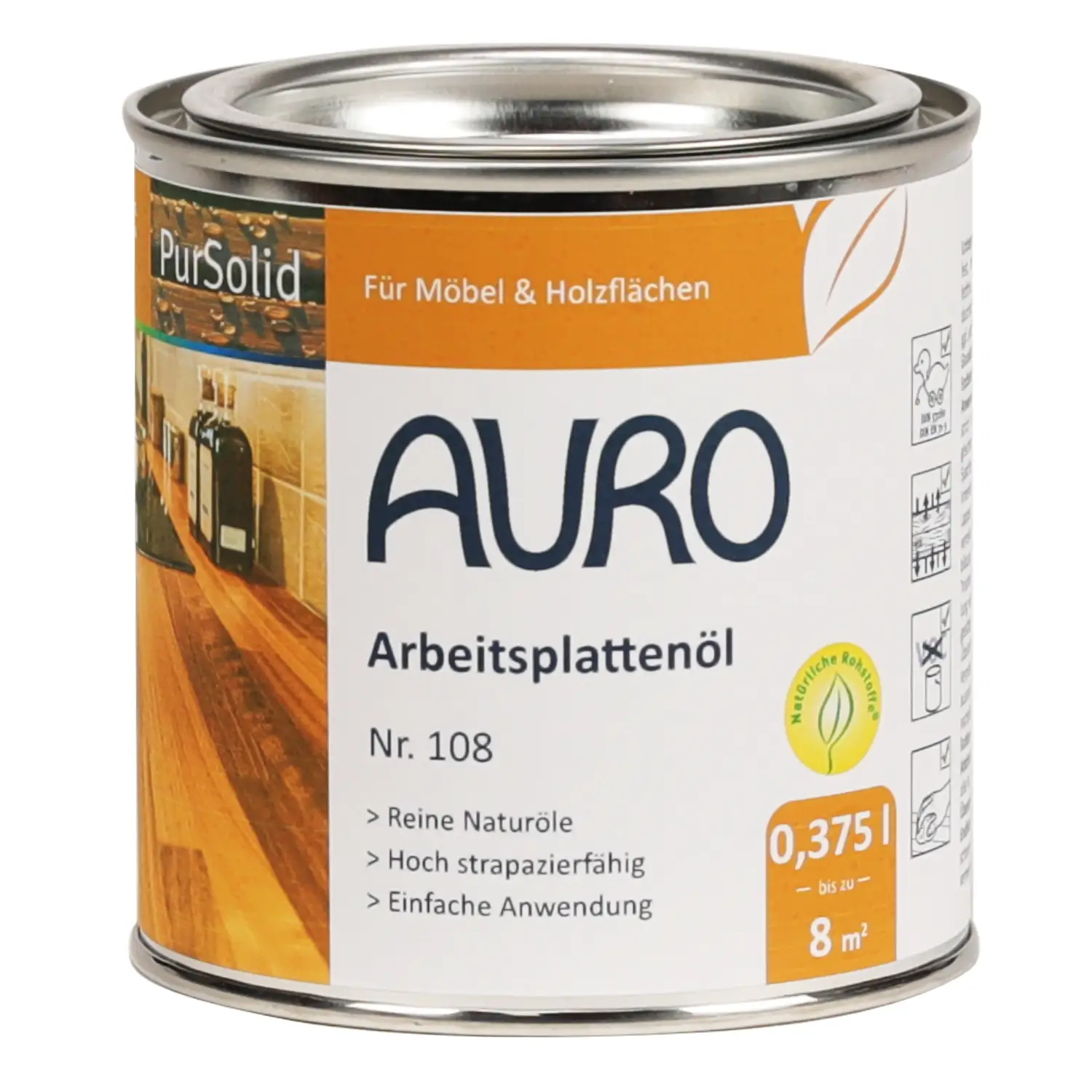 Das AURO Arbeitsplattenöl Nr. 108 ist ein lösemittelfreies Öl zur Pflege von Arbeitsplatten und Küchenfronten aus Massivholz. Atmungsaktiv. Unterstreicht die Holzmaserung feuert an und schützt vor Wasser und Schmutz.