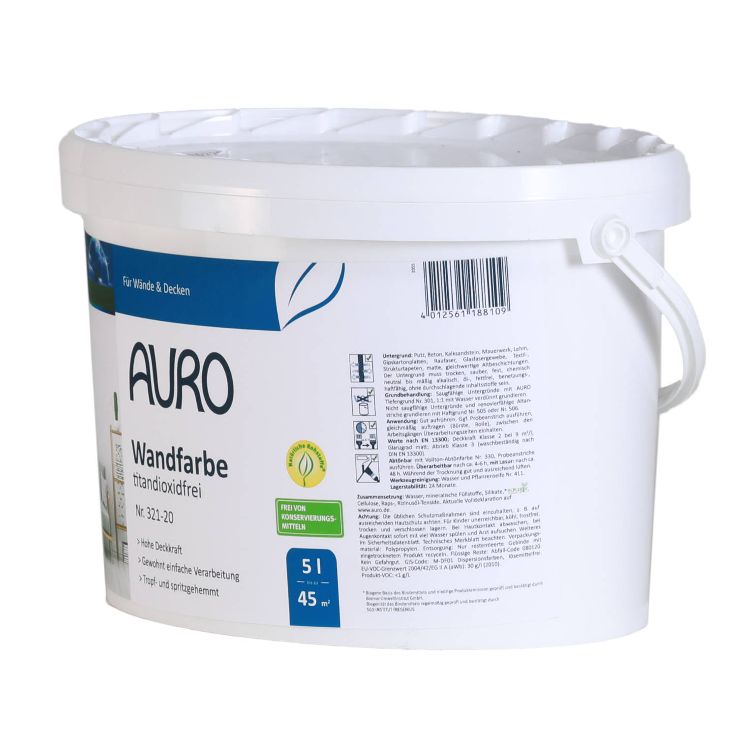 Die neue titandioxidfreie AURO Wandfarbe Nr. 321-20, ist eine Konservierungsmittel freie, dauerhaft matt-weiße Dispersions-Wandfarbe in waschbeständiger Qualität. Tropft und spritzt wenig bei der Verarbeitung und hat eine hervorragende Deckkraft. Sie kann farbig abgetönt werden mit AURO Vollton- und Abtönfarbe Nr. 330 (Beispiel: Vollton- und Abtönfarbe Nr. 330) oder lasiert werden mit AURO Wandlasur-Pflanzenfarbe Nr. 360 (Beispiel: Wandlasur Pflanzenfarbe Nr. 360) bzw. mit den schmutzabweisenden AURO Wandlasur-Wachsen Nr. 370 (Beispiel: Wandlasur Wachs Nr.-370).
