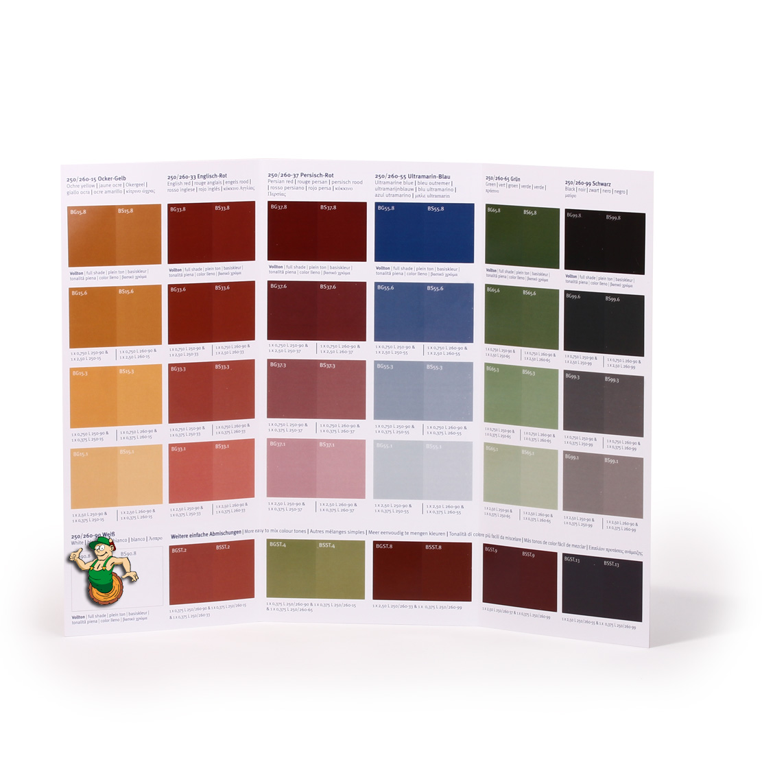Den Buntlack Nr. 260 gibt es in 6 Farbtönen, diese können untereinander gemischt werden. Eine Übersicht erhalten Sie in der Farbkarte.