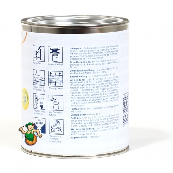 Das Gartenmöbelöl Aqua Nr. 115 ist ein wasser- und schmutzabweisendes, dunkelbraun pigmentiertes Öl. Das Öl ist lösungsmittelfrei, wasserverdünnbar und einfach mit Wasser und Pflanzenseife aus dem Pinseln auszuwaschen. Es eignet sich hervorragend zur Auffrischung von alten oder abgewitterten Gartenmöbeln. Regelmäßig angewendet, wird das Holz vor Ausbleichung, Feuchtigket und Vergrauung zuverlässig geschützt.