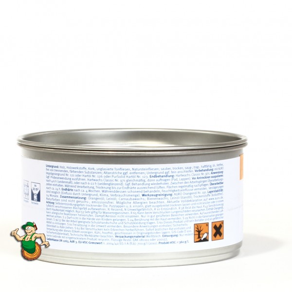 Das Hartwachs Classic Nr. 971 von AURO ist ein edler Balsam aus Pflanzenwachs (Carnaubawachs) und Bienenwachs, der das Holz schützt und veredelt. Er eignet sich zur Behandlung von Oberflächen von Möbeln oder Fussböden aus Holz, Kork und Linoleum. Sogar unglasierte Tonfliesen können damit behandelt werden.