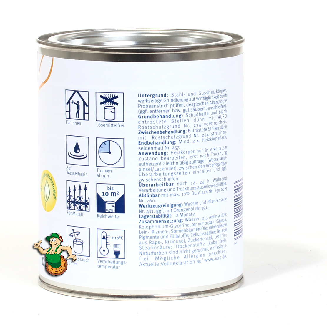 Verleiht Stahl- und Gussheizkörpern ein neues Aussehen. Dieser Lack ist lösemittelfrei, seidenmatt weiß und bis zu 70 Grad hitzebeständig. Abtönen mit AURO Buntlack glänzend Nr. 250 (etwa dem Buntlack -glänzend- Nr. 250 Ocker-Gelb) oder AURO Buntlack seidenmatt Nr. 260 (beispielsweise mit dem Buntlack -seidenmatt- Nr. 260 Englischrot) möglich. Bei Bedarf verwenden Sie einen Farbrührstab.