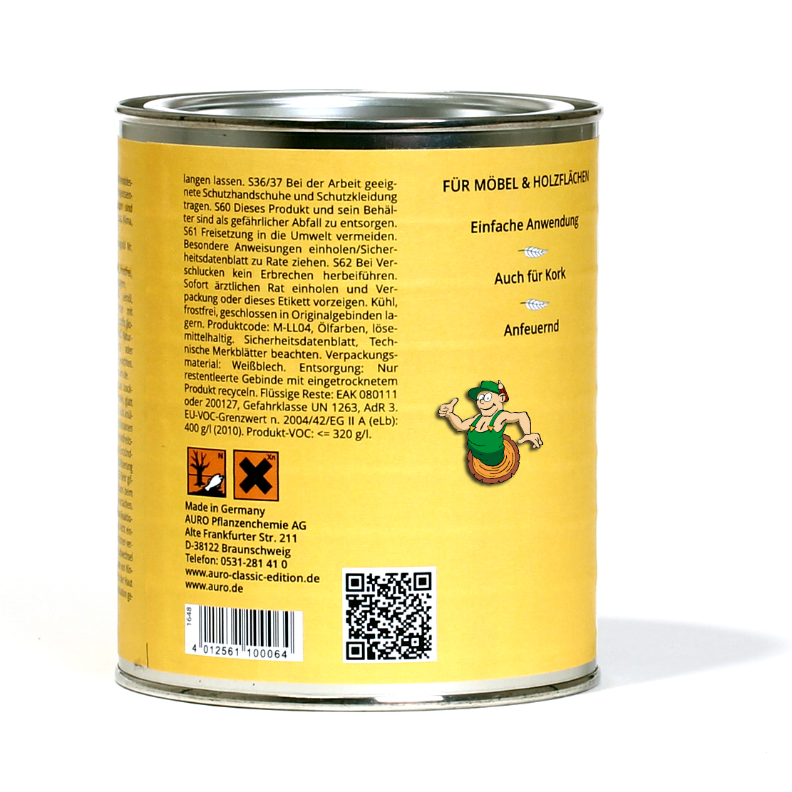 Endbehandlung: Abhängig vom Untergrundmaterial und der Oberflächenbeanspruchung sind z.B. folgende Schlussbehandlungen möglich: Mit AURO Imprägniergrund Nr. 121, Hartöl Nr. 126, Hartwachs Nr. 171, Möbelbalsam Nr. 173 oder Bienenwachsbalsam Nr. 981. Bitte beachten Sie für Hinweise zur Verarbeitung das jeweilige Technische Merkblatt.