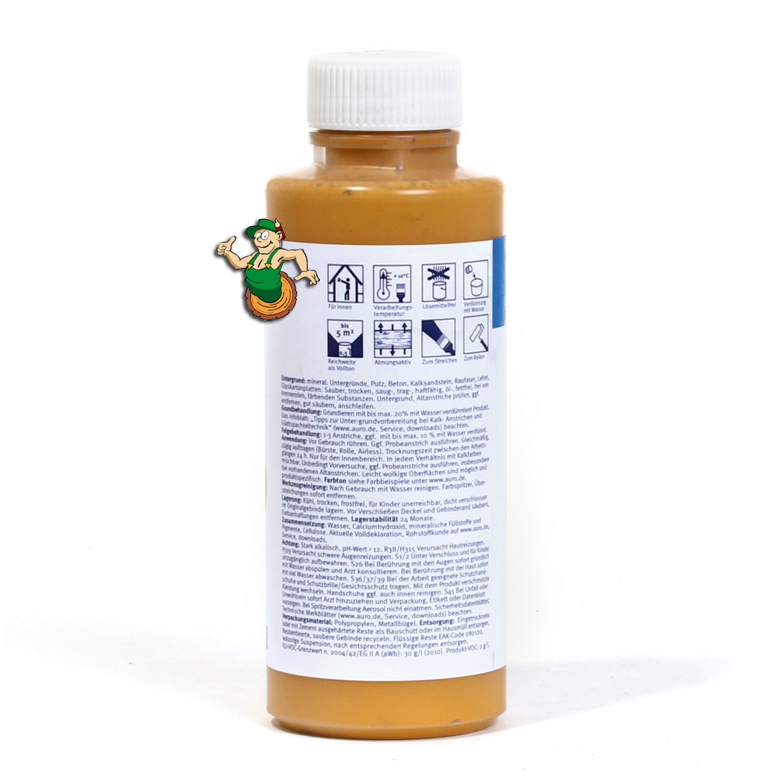 Die AURO Kalk-Buntfarbe Nr. 350 ist die farbige Version der Kalkfarbe. Sie kann als Volltonfarbe pur gestrichen oder zur Abtönung der meisten AURO Kalkprodukte verwendet werden. Bei Produkten wie Profi-Kalkspachtel Nr. 342, Profi-Kalkfeinputz Nr. 345, Profi-Kalkputz Nr. 347, Anti-Schimmelfarbe Nr. 327, Kalkcasein-Wandfarbe Nr. 751 und Frischeweiß Nr. 328 muss ggf. mit der Beeinflussung der spezifischen Eigenschaften gerechnet werden, wenn erhebliche Mengen beigemischt werden.