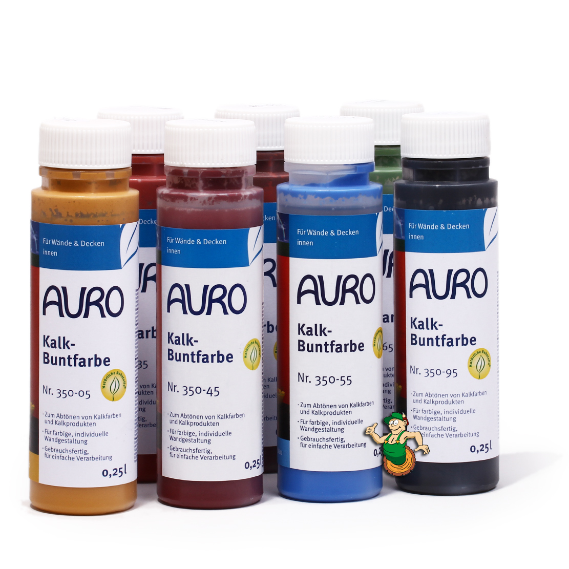 Die AURO Kalk-Buntfarben sind in verschiedenen Farbtönen erhältlich, z. B. Oxid-Rot, Grün oder Lichtblau.