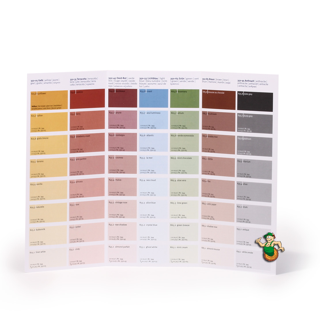 Je nach Abdeckung 1–2 Anstriche mit Kalk-Buntfarbe Nr. 350, ggf. max. 10 % Wasser verdünnt. Zwischen den Anstrichen mindestens 24 Stunden Trocknungszeit einhalten.