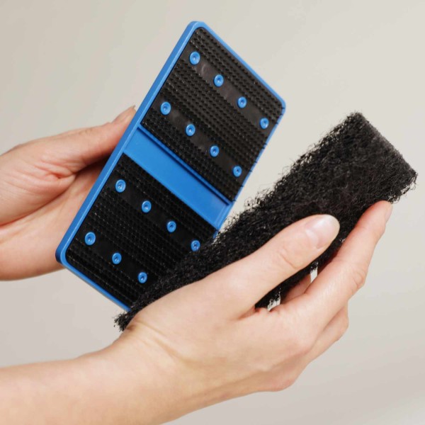 Der Padhalter hat einen Handgriff, um genau und sicher arbeiten zu können. Er ist für Reinigungspads, Massierpads sowie Polierpads im Format 150 mm x 90 mm geeignet. Auf der Unterseite befinden sich Noppen, auf die die Pads einfach aufgelegt werden können.