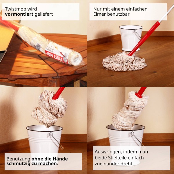 Der Vileda Professional Twistmop (früher auch als Swepmop bekannt) eignet sich hervorragend für die feuchte Alltagspflege bzw. Reinigung geölter Parkettböden mit Holzbodenseife. Natürlich können mit ihm auch andere Oberflächen, wie Laminat- oder Steinböden gereinigt werden. Der Mopaufsatz besteht zu 100% aus Baumwolle und lässt sich problemlos austauschen und waschen (bei 60 Grad). Mit dem Twistmop brauchen Sie Ihre Hände nicht mehr nass zu machen. Das Seifen- oder Schmutzwasser wird durch das gegeneinander Verdrehen der Griffteile am Stiel, ausgewrungen. Also benötigen Sie bloß noch einen Wassereimer (nicht im Lieferumfang enthalten!) um mit der Reinigung zu beginnen. Eine zusätzliche Presse oder Ähnliches ist somit überflüssig.