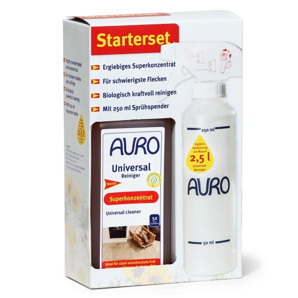 Der AURO Universal-Reiniger Starterset enthält ein 0,5 Liter-Gebinde des bewährten Universalreiniger Nr. 471 und einen 0,25-Liter Sprühspender.
