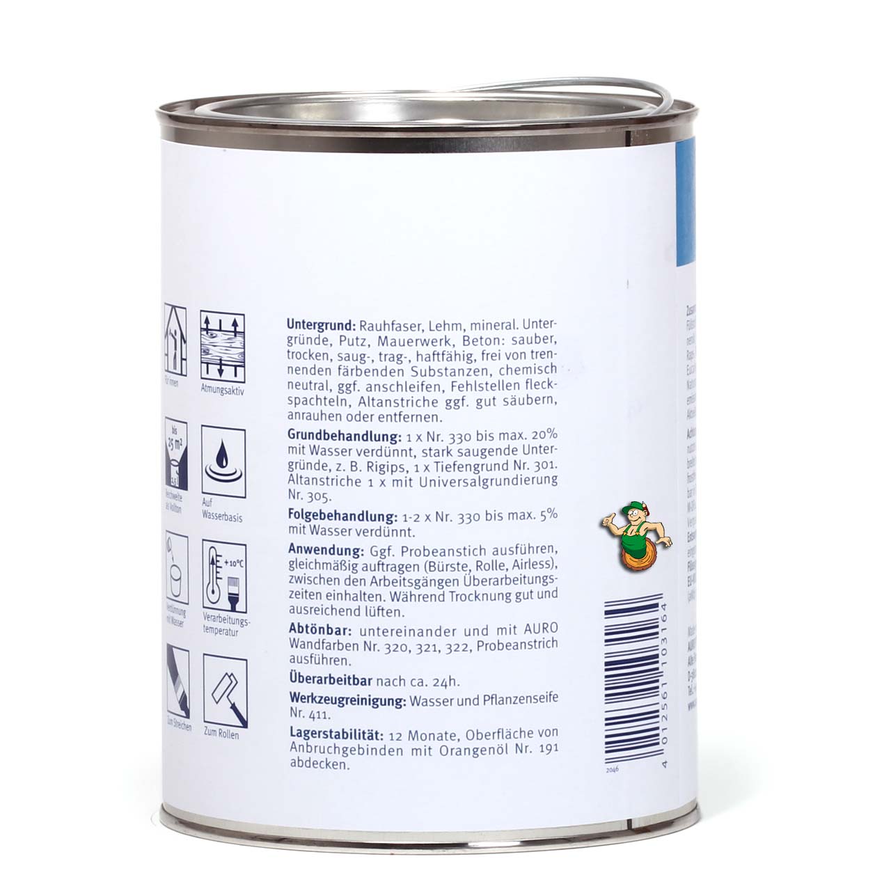 Kurzübersicht Konsequent ökologische Rohstoffauswahl Hoch diffusionsoffen (sd-Wert < 0,05 m) Angenehmes Raumklima, rein mineralisch, schimmelhemmend Im Nasszustand lasierend, nach Trocknung deckfähig Mehrfach überstreichbarer, matter Anstrich mit kalktypischem Charakter Allgemeine Informationen Für ein einfach herrliches Raumklima: emissionsfreie, diffusionsoffene Farbe auf Sumpfkalkbasis. Rein mineralisch, schimmelhemmend und geruchsabsorbierend. Geeignet für Neubauten sowie für die Altbausanierung. Die Farbe haftet gut auf allen mineralischen Untergründen, wie Putzen, Beton und Kalksandstein, sowie auf Lehm, Gipskarton, Raufaser und Mineralfarben. Für den Innen- und Außenbereich geeignet. Innenwände können mit allen Farbtönen der AURO Kalk- und Buntfarbe Nr. 350 (z. B. Kalk-Buntfarbe Nr. 350-05 Gelb) abgetönt werden. Farbton Weiß. Abtönbar für den Innenbereich mit AURO Kalk-Buntfarbe Nr. 350. Inhaltsstoffe Wasser, Calciumhydroxid, Titandioxid, mineralische Füllstoffe, Cellulose. Verarbeitung Untergrund Geeignete Untergründe im Innenbereich sind mineralische Untergründe (z. B. Putze, Beton, Kalksandstein), sowie Lehm, Gipskarton, Raufaser und Mineralfarben. Geeignete Untergründe im Außenbereich sind unbehandelte, saugfähige und wetterfeste mineralische Untergründe (z. B. Putze, Beton, Kalksandstein). Nicht geeignet sind Holz, Kunststoffe und kunststoffähnliche Oberflächen, kunststoffhaltige Beschichtungen oder Wandbekleidungen, glänzende oder lackähnliche Beschichtungen sowie schlecht haftende oder nicht tragfähige Altanstriche. Der Untergrund muss fest, trag- und haftfähig, leicht saugfähig, wasserbenetzbar sowie sauber, staub-, öl-, fett- und ausblühungsfrei sein. Er darf nicht mehlend oder sandend sein und keine durchschlagenden Inhaltsstoffe enthalten. Anstrichaufbau Untergrundvorbereitung Lose sitzende Teile, Staub, Verschmutzungen sowie öl- oder kunststoffhaltige Rückstände vollständig entfernen Sinterschichten abschleifen, Trennmittel abwaschen (z. B. mit AURO Lack- und Lasurreiniger Nr. 435) Mehlende oder wischende Flächen trocken abbürsten oder abwaschen Löcher und Risse mit geeignetem Material ausgleichen Putze reinigen und ggf. 1–2 Tage vor dem Anstrich leicht annässen Alte mineralische Anstriche trocken abbürsten oder nass reinigen Festsitzende Altanstriche abkehren, absaugen, reinigen und leicht anrauen Schlecht haftende oder abblätternde Altanstriche restlos entfernen Offene Tapetennähte nachkleben, Kleberreste entfernen und erst nach Trocknung überarbeiten Nicht zu behandelnde Flächen (z. B. Glas, Keramik, Holz, Metall) sorgfältig abdecken und schützen Grundbehandlung Untergründe wie Kalksandstein, Gipskartonplatten, mit AURO Wandspachtel Nr. 329 bearbeitete Flächen sowie kontrastreiche Untergründe mit verdünntem Produkt (bis max. 20 % Wasser) oder mit AURO Tiefengrund Nr. 301 vorbehandeln. Als Grundierung im Außenbereich kann AURO Haftgrund Nr. 506 verwendet werden. Folgebehandlung Nach entsprechender Vorbereitung des Untergrundes erfolgen im Innenbereich 1–2 Anstriche, im Außenbereich 2–4 Anstriche mit dem Produkt, verdünnt mit maximal 10 % Wasser. Zwischen den einzelnen Anstrichen mindestens 24 Stunden Trocknungszeit einhalten. Auftragsverfahren Zügig und gleichmäßig streichen oder rollen. Auch für Airless-Spritzgeräte geeignet, z. B. Storch Airless-Gerät SL 1000 oder 1500 oder vergleichbare Geräte. Verbrauch Ca. 0,10 l/m² je Anstrich. 1 Liter reicht für ca. 10 m² auf glattem, schwach saugendem Untergrund. Der tatsächliche Verbrauch hängt von Verarbeitungsart, Struktur und Saugfähigkeit des Untergrundes ab und sollte durch Probeanstriche ermittelt werden. Werkzeug & Zubehör Werkzeuge nach Gebrauch mit Wasser reinigen. Farbspritzer und Überstreichungen vermeiden und gegebenenfalls sofort entfernen.