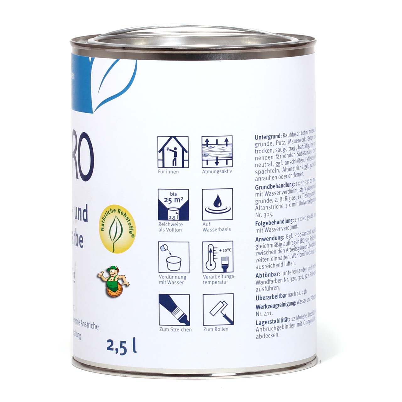 Konservierungsmittelfreie, dauerhaft matt-weiße Dispersions-Wandfarbe in waschbeständiger Qualität. Tropft und spritzt wenig bei der Verarbeitung und hat eine hervorragende Deckkraft. Sie kann farbig abgetönt werden mit AURO Vollton- und Abtönfarbe Nr. 330 (Beispiel:  Vollton- und Abtönfarbe Nr. 330)oder lasiert werden mit AURO Wandlasur-Pflanzenfarbe Nr. 360 (Beispiel: Wandlasur Pflanzenfarbe Nr.-360)bzw. mit den schmutzabweisenden AURO Wandlasur-Wachsen Nr. 370 (Beispiel: Wandlasur Wachs Nr.-370). Nach den Kriterien des AgBB geprüft und für den Wohnraum empfohlen. Geprüfte Qualität: Biogenität des Bindemittels regelmäßig geprüft und bestätigt durch SGS INSTITUT FRESENIUS. Jetzt mit neuer Rezeptur: Das biogene Bindemittel REPLEBIN®  - emissionsfrei und mit Profi-Produkteigenschaften, bessere Untergrundverträglichkeit und Haftung, ölfrei, mit geringen Trocknungsgerüchen und ohne Dunkelgilbung. Darüber hinaus ermöglicht der Einsatz von Kaliwasserglas zur Erhöhung des pH-Wertes den Verzicht auf Konservierungsmitttel!VerarbeitungDer Untergrund muss trocken, sauber, fest, chemisch neutral, öl-, fettfrei, saug-, haftfähig, ohne durchschlagende Inhaltsstoffe sein.AURO Wandfarbe 321 ist geeignet auf Putz, Beton, Kalksandstein, Mauerwerk, Lehm, Gipskartonplatten, Raufaser und matten, gleichwertigen Altbeschichtungen.  UntergrundvorbereitungLose sitzende Teile abkehren, entfernen oder ausbessern, mehlende, sandende Substanzen durch Abbürsten beseitigen. Untergrund auf Neutralität prüfen, ggf. neutralisieren. Sinterhaut durch Abschleifen, Trennmittel durch Abwaschen entfernen. Fehlstellen, Löcher, Risse ggf. mit Wandspachtel Nr. 329 beispachteln und Spachtelgrate abschleifen. Offene Tapetennähte nachkleben, Kleisterreste entfernen. Schlecht haftende, nicht haftfähige, nicht benetzungsfähige oder ungeeignete Altanstriche restlos entfernen. GrundbehandlungIntakte, gleichmäßig, schwach saugende Untergründe mit AURO Wandfarbe mit max. 20% Wasser verdünnt mit Bürste grundieren. Stark, ungleich saugende Untergründe und Rigips mit Tiefengrund Nr. 301 1:1 mit Wasser verdünnt grundieren. ZwischenbehandlungMit Pinsel, Bürste, Rolle, Spritzgerät (Airless) gleichmäßig auftragen. Je nach Untergrundbeschaffenheit und Arbeitsweise kann mit max. 10% Wasser verdünnt werden. Für eine farbige Gestaltung AURO Wandfarben mit AURO Vollton- und Abtönfarbe Nr. 330 (zum Beispiel mit Vollton- und Abtönfarbe Nr. 330)abtönen. Für kräftige Farbtöne werkseitige Abtönungen bevorzugen. Durch Abtönung mit Nr. 330 vermindert sich die Abriebfestigkeit um mindestens 1 Klasse. Es empfehlen sich repräsentative Vorversuche und Probenanstriche, um Abtönung, Farb- und Raumwirkung zu testen. SchlussbehandlungWie oben beschrieben, bei Bedarf max. 5% Wasser zugeben. Die Schlussbehandlung entfällt, wenn die gewünschte Optik bereits erreicht ist. Die Durchtrocknung und volle Belastbarkeit ist nach ca. 28 Tagen erreicht. NachbehandlungenMöglich sind gestalterische, dekorative Folgebehandlungen mit AURO Wandlasur-Pflanzenfarben Nr. 360 (Beispiel: Wandlasur Pflanzenfarbe Nr.-360), Wandlasur-Wachsen Nr. 370 (beispielsweise mit Wandlasur Wachs Nr.-370) oder Wandlasur Bindemittel Nr.-379 mit Pigmentzugaben. Vor dem lasieren bitte 5 Tage trocknen lassen.Bitte beachten Sie immer auch das aktuelle Technische Merblatt.AuftragsverfahrenStreichen, Rollen, Spritzen (airless)FarbtonAbtönbar mit AURO Vollton- und Abtönfarbe Nr. 330 wie der Vollton- und Abtönfarbe Nr. 330.Lasierbar mit AURO Wandlasur-Pflanzenfarbe Nr. 360 (siehe etwa Wandlasur-Pflanzenfarbe Nr. 360)bzw. den schmutzabweisenden AURO Wandlasur-Wachsen Nr. 370 - beispielsweise mit Wandlasur - Wachs Nr. 370.InhaltsstoffeWasser, mineralische Füllstoffe, Titandioxid, Replebin, Silikate, Kaliwasserglas, Cellulose, Raps-, Rizinusöl-Tenside.VerbrauchCa. 0,1 - 0,14 l/m² pro Anstrich. Bitte genauen Verbrauch am Objekt bestimmen.Werkzeug & Zubehör Gründlich ausstreichen/ abstreifen und dann mit Wasser spülen. Ggf. mit Pflanzenseife Nr. 411 (verdünnt) nachwaschen.